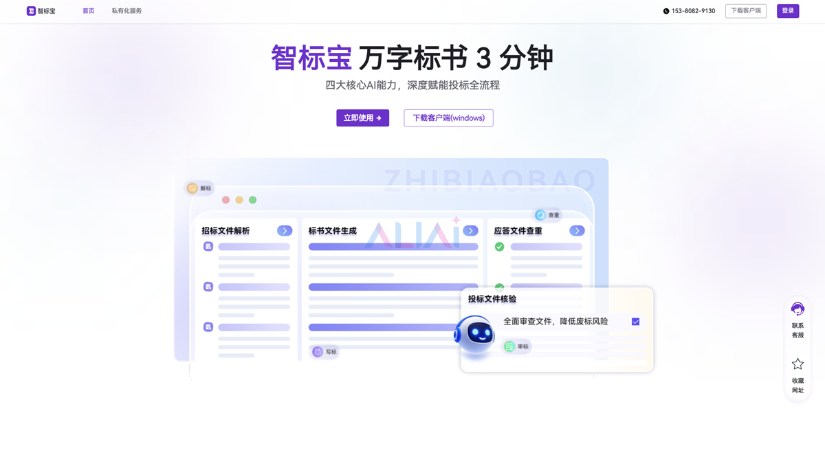 智标宝是一款基于前沿AI技术的智能标书生成利器,深度赋能投标全流程,多维度攻克投标痛点,高效提升投标效率与质量,让你轻松斩获更多商机!