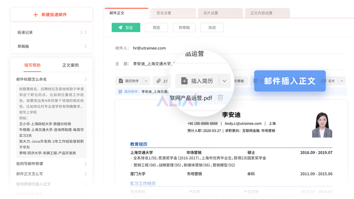 核心功能包括智能简历创建与排版、中英文一键互译、多端同步编辑以及邮件直投。
