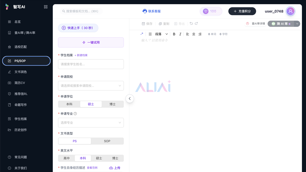 超强智写AI留学神器,帮你搞定留学申请材料!无论是个人陈述(PS)、简历(CV)还是推荐信(RL),都能根据你的背景量身打造,秒变高质量专业文书。还有AI检测、润色、改写等,文书再也不怕出错,轻松提升申请竞争力!